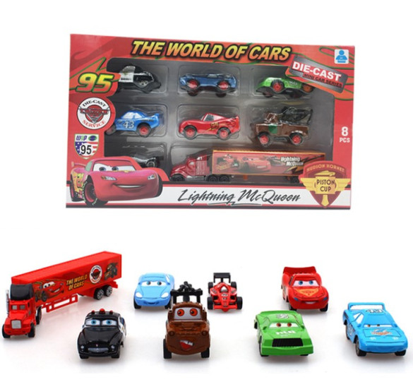 McQueen Cars Complete 8 pc Collection Set. Get push around play with Lightning McQueen as a vehicle or open it up and discover a racing play set inside. It is loaded with iconic details and several play areas for tons of creative fun. You can also choose a transforming Mater vehicle with a real working tow, signature junkyard goods and storage.