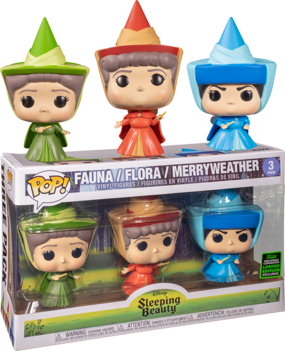 Funko Pop Sleeping Beauty - Flora, Fauna Merryweather Fairy Godmother Vinyl Figure 3 Pack. Figure stands 3.75 inches and comes in a window display box.
