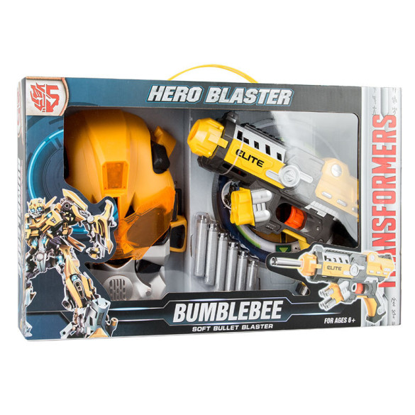 Blast into overdrive with this Bumblebee Toy Nerf Elite Blaster that features Transformers Bumblebee character deco! Design daring stunts for the Bumblebee, Cliffjumper, and Barricade foam body cars. Blast the cars up the ground bridge and through the barrier! The combination of the Nerf Nitro blasting and Transformers characters launches kids into lots of stunt action and storytelling adventures.