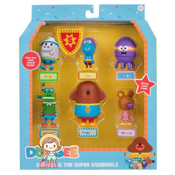 Expand your child's toy collection with the addition of this pack of Hey Duggee Duggee & The Super Squirrels. This product features action figures of the main characters on the hit British TV show for kids. The program is based on The Squirrel Club, which is an activity club for children that allows them to enjoy different adventures and earn badges for accomplishments.