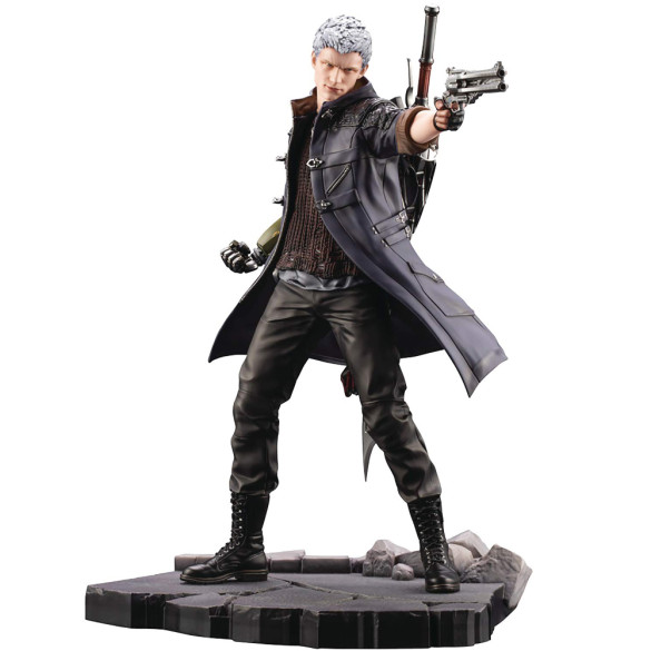 Nero, the young demon hunter from "Kotobukiya Devil May Cry 5: Nero Artfx J Statue! He's got the Blue Rose revolver in his left hand and the Red Queen sword mounted to his back; two different Devil Breaker arms (Punchline and Overture) are also included. The level of detail in the sculpting and painting is impressive, especially the texture of his coat and boots. A base is included; display him together with Dante for maximum impact! [Figure Size]: Approximately 27cm (10.6") tall
