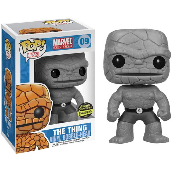 Funko Pop The Thing #09 Vinyl Figure. Fantastic Four, the movie, is about four young outsiders that gain superhuman powers as they alter their physical form in shocking ways. Reed Richards becomes Mr. Fantastic, while pal Ben Grimm gains immense strength as the Thing. Johnny Storm becomes the Human Torch and his sister Sue becomes the Invisible Woman. Together, the team must harness their new abilities to prevent Doctor Doom from destroying the Earth. The Thing stands as the second most powerful individual on the planet. Here we have The Thing in his stone form but with an added twist, all Black and White Gemini Exclusive edition.