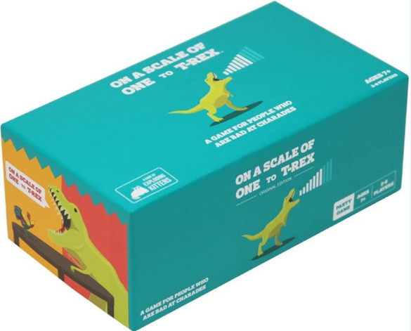 On a Scale of One to T-Rex is a family-friendly party game for people who are bad at charades. Players must perform ridiculous actions like "Be a T-Rex," "Scratch an Itch You Can't Reach," or "Be a Hula Dancer" on a scale of 1 to 10. The twist is that the quality of your action doesn 't matter - you earn points by guessing and matching the intensity each player is performing their action.