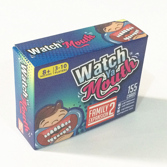 Family (ages 8+), phrase expansion pack for the authentic, hilarious mouth guard game, Watch Ya' Mouth. A belligerent bison is on the board walk, and playful porpoises are surfing waves. This is an expansion pack only and does not include cheek retractors. It is 150 thick, high quality, high humor cards and 10 blank cards.