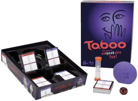 It’s not what you say…It’s what you don’t say! Time is against you. You know what you’d like to say if you could only find the words. But some things in life are strictly…TABOO. Example: How do you get your team to say the word BIRTHDAY…if you can’t say the words HAPPY, ANNIVERSARY, CANDLES, PRESENTS or CAKE? You might say: “Friends and family sing to you once each year”, or “You celebrate this event by blowing out a fire on top of a frosted dessert.” Or you might hum the well-known tune until your team shouts “Birthday!” Each time your team shouts out the secret word, you get a point! TABOO…it’s unspeakable fun.